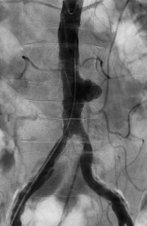 He underwent a CT scan which showed a 5 cm dilatation of his large artery in the abdomen called aorta (saccular infrarenal aortic aneurysm).