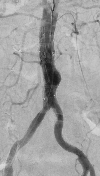 This was treated by interventional radiology using pinhole techniques. A small access was placed in the right groin artery (right CFA) and repair was done endovascularly using a Medtronic Renu cuff. The device was placed percutaneously and the access site closed using Proglide closure device by Abbott.